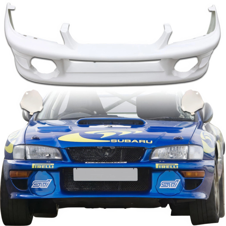 Another great feature of the FRP LS WRC 00 Front Bumper w Caps 3pc >(GC8)> 2/4dr is its customizable finish. It can be painted to match your vehicles color, offering a personalized and cohesive look. This customization ensures that your Subaru Impreza will not only perform better but also stand out with a unique and stylish appearance.